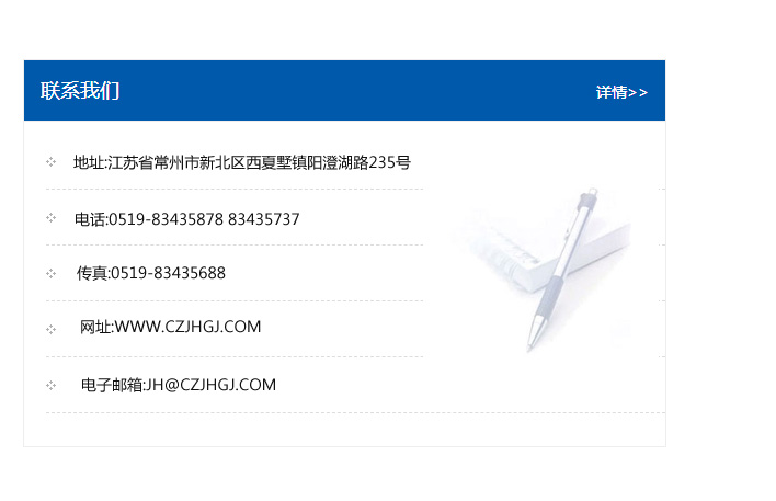 傳真:0519-83435688    郵編:213135    網(wǎng)址:WWW.czjhgj_com.ryx168.com    電子郵箱:JH@czjhgj_com.ryx168.com